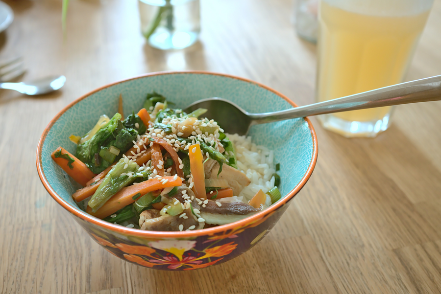 Serve the vegetables on the rice and garnish with sesame seeds.